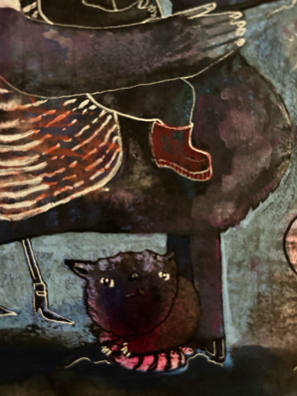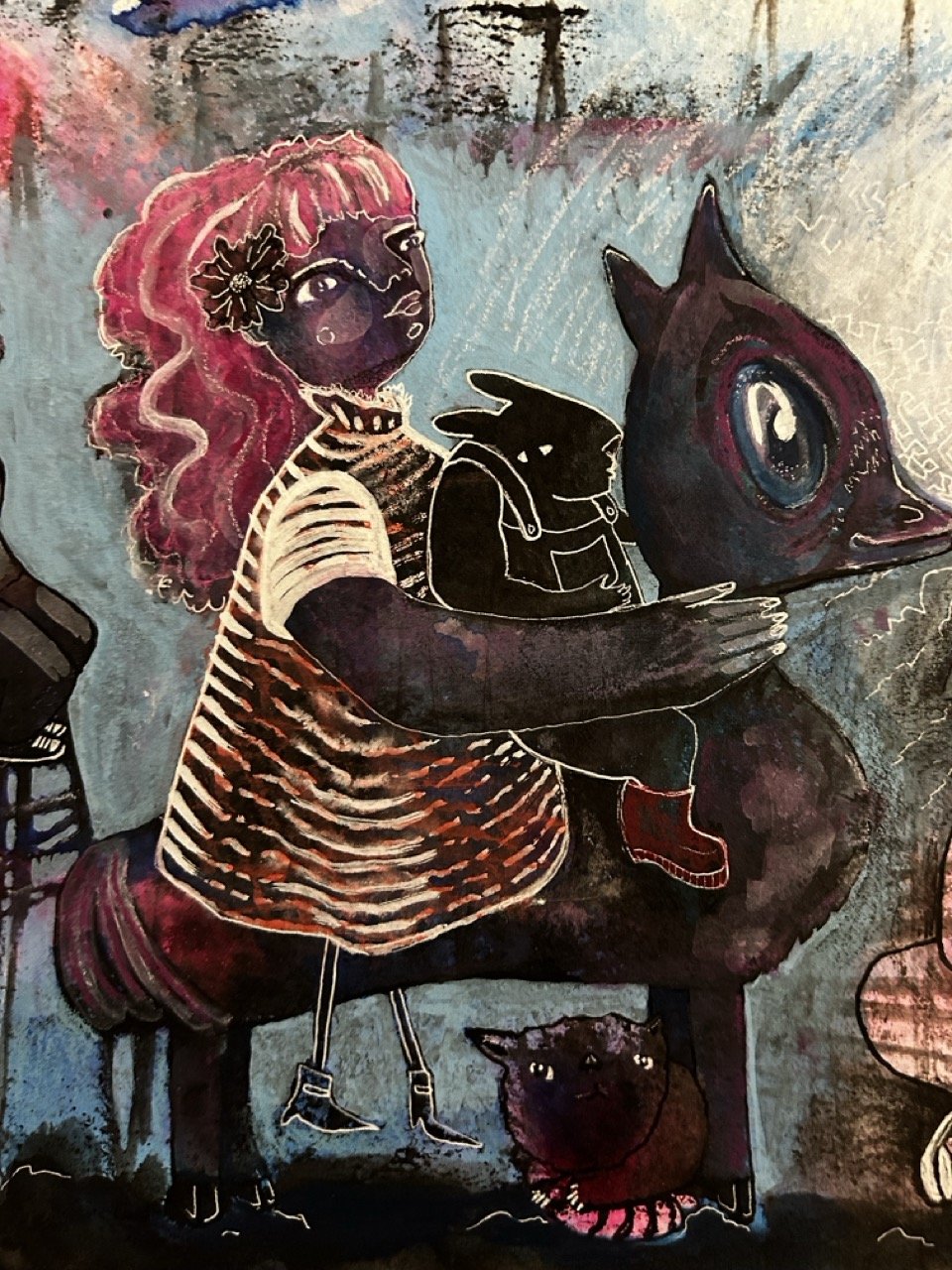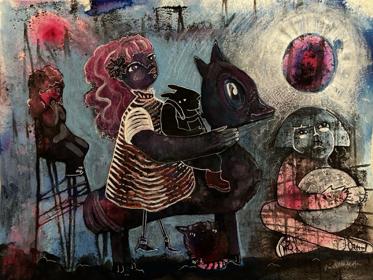 Water-based mixed media on paper, sealed and mounted on wood panel. “Framed” with a 1/8” wood border.